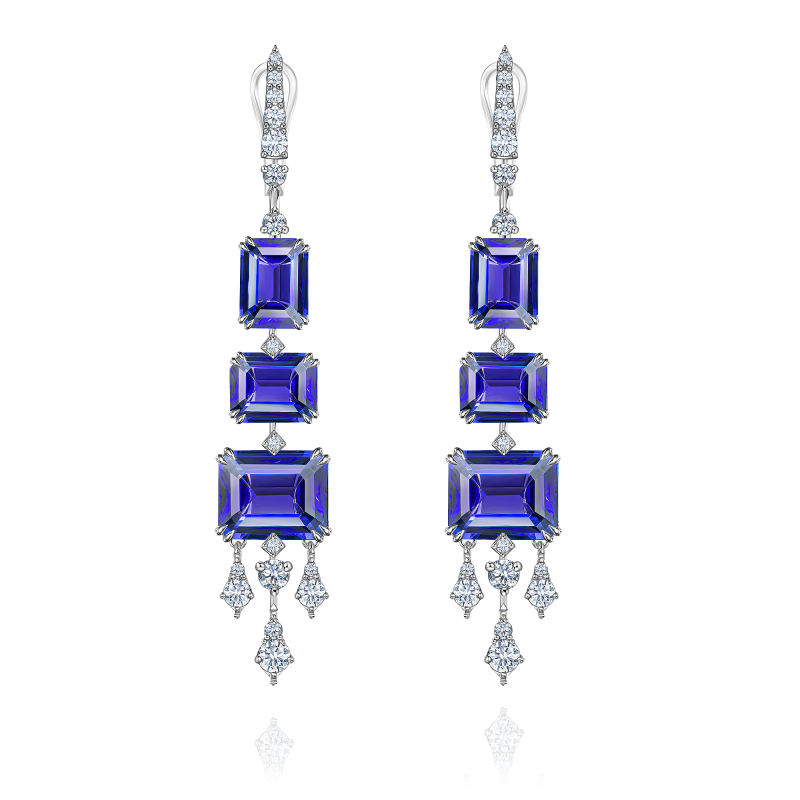 Octagon-cut tanzanites. Round-cut diamonds.