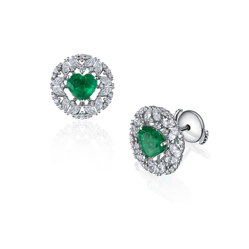 Heart-cut emeralds. Marquise-cut and round-cut diamonds.