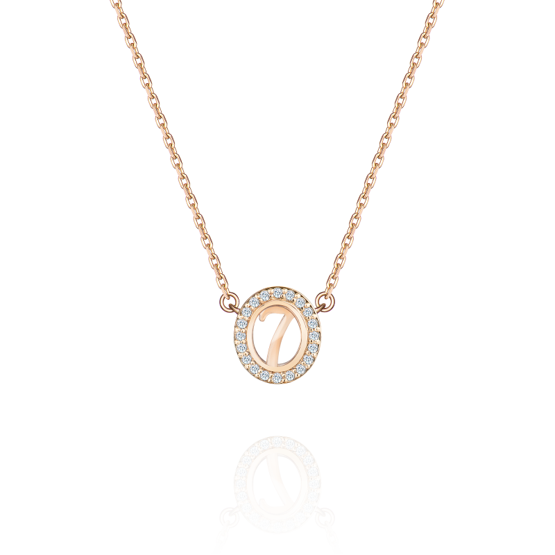 Elegant pendant on a chain with three levels of length in rose gold. The gold number in the center of the pendant is securely hidden by sapphire crystal and framed by a shining diamond scattering. The role of the figure here is conditional and ambiguous. It can be a password, a signal, or a symbol, the essence and meaning of which are known only to you.