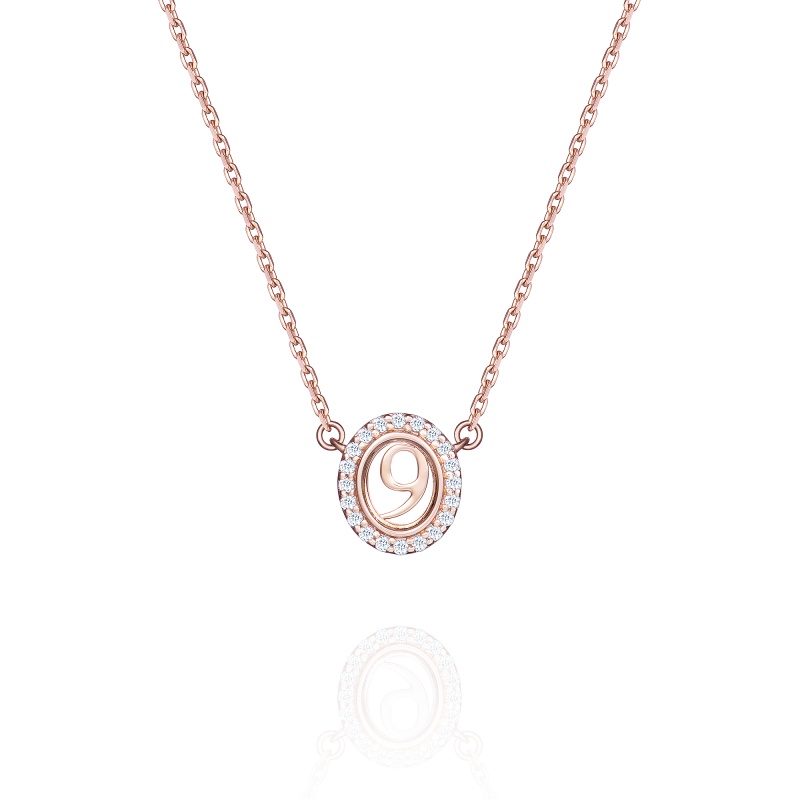 Elegant pendant on a chain with three levels of length in rose gold. The gold number in the center of the pendant is securely hidden by sapphire crystal and framed by a shining diamond scattering. The role of the figure here is conditional and ambiguous. It can be a password, a signal, or a symbol, the essence and meaning of which are known only to you.