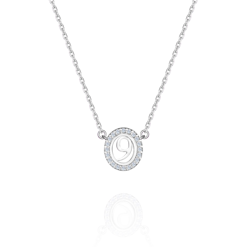 Elegant pendant on a chain with three levels of length in white gold. The gold number in the center of the pendant is securely hidden by sapphire crystal and framed by a shining diamond scattering. The role of the figure here is conditional and ambiguous. It can be a password, a signal, or a symbol, the essence and meaning of which are known only to you.