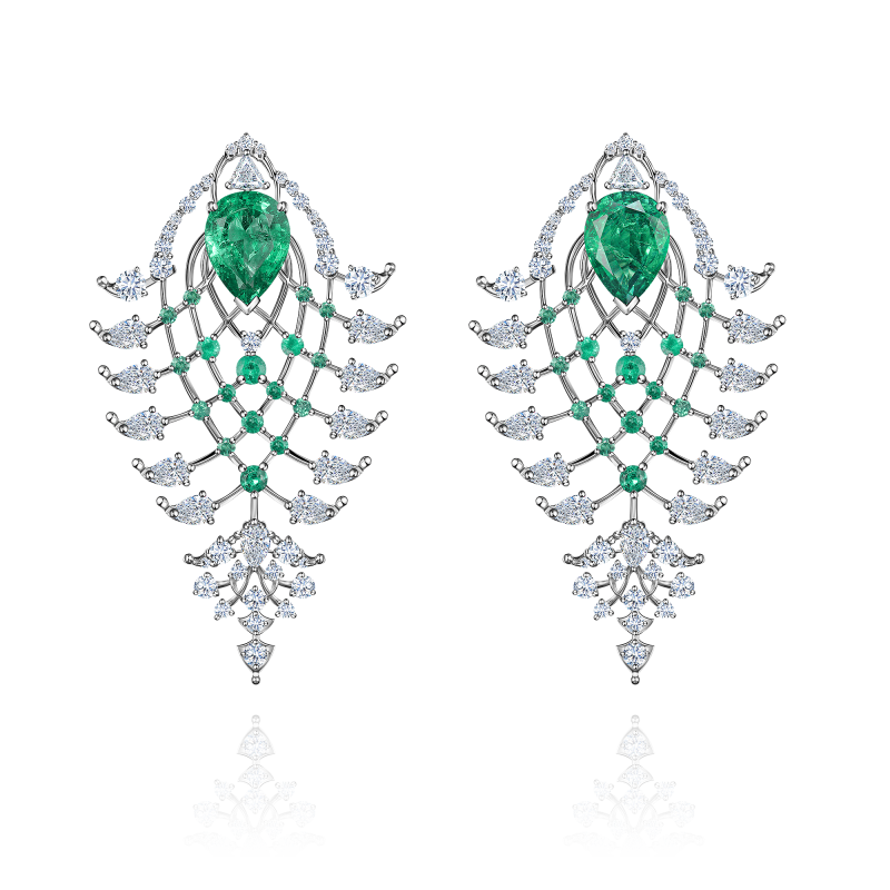 Pear-cut and round-cut emeralds. Pear-cut, trillion-cut and round-cut diamonds.