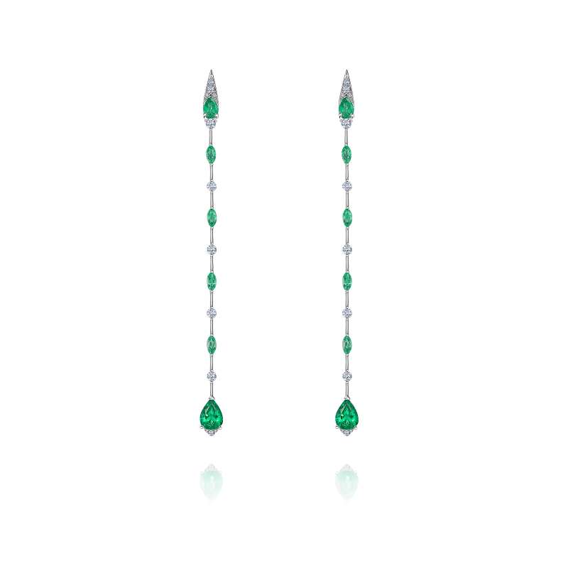 Pear and marquise cut emeralds. Round-cut diamonds.