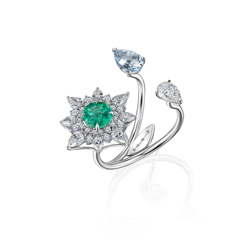 A round-cut emerald. Aquamarine cut pear. Pear-cut and round-cut diamonds.