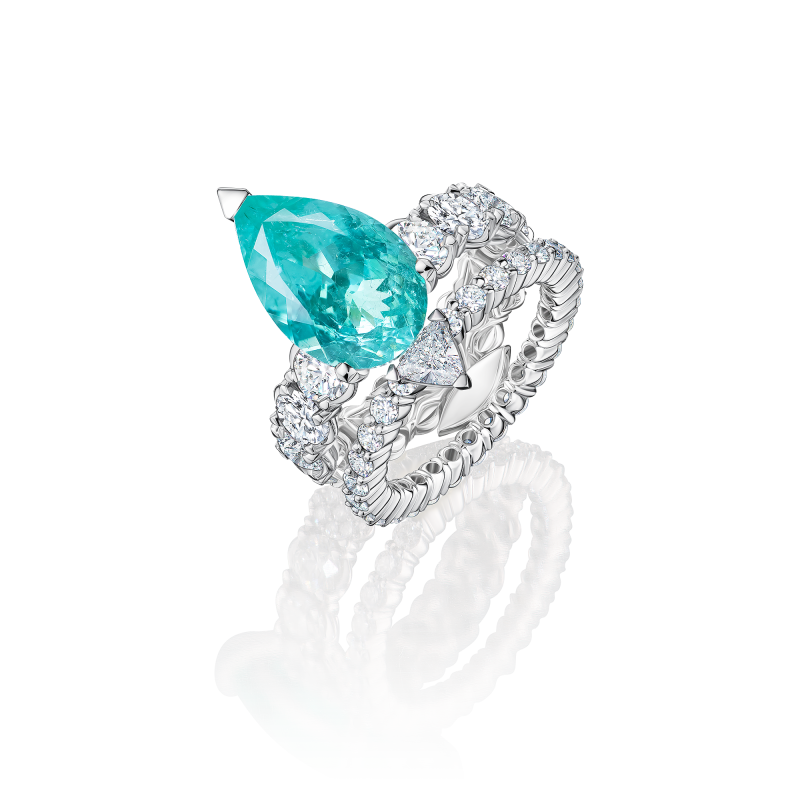 Tourmaline Paraiba cut pear. Oval, trillion and round cut diamonds.