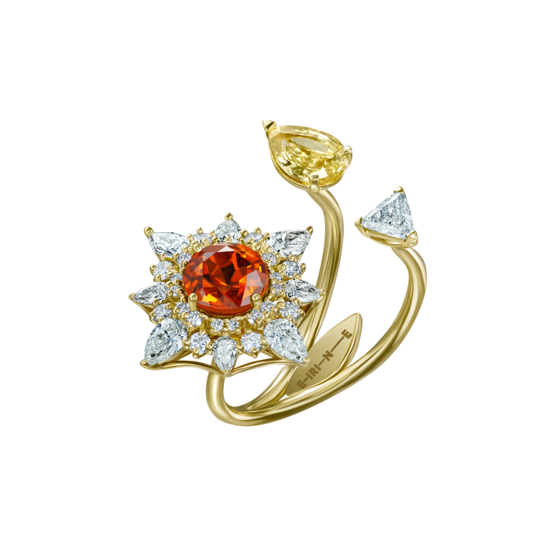 Garnet Spessartin round-cut. Sapphire pear-cut. Pear-cut, trillion-cut and round-cut diamonds.