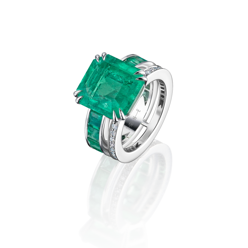 Square-cut and emerald-cut emeralds. Round-cut diamonds.