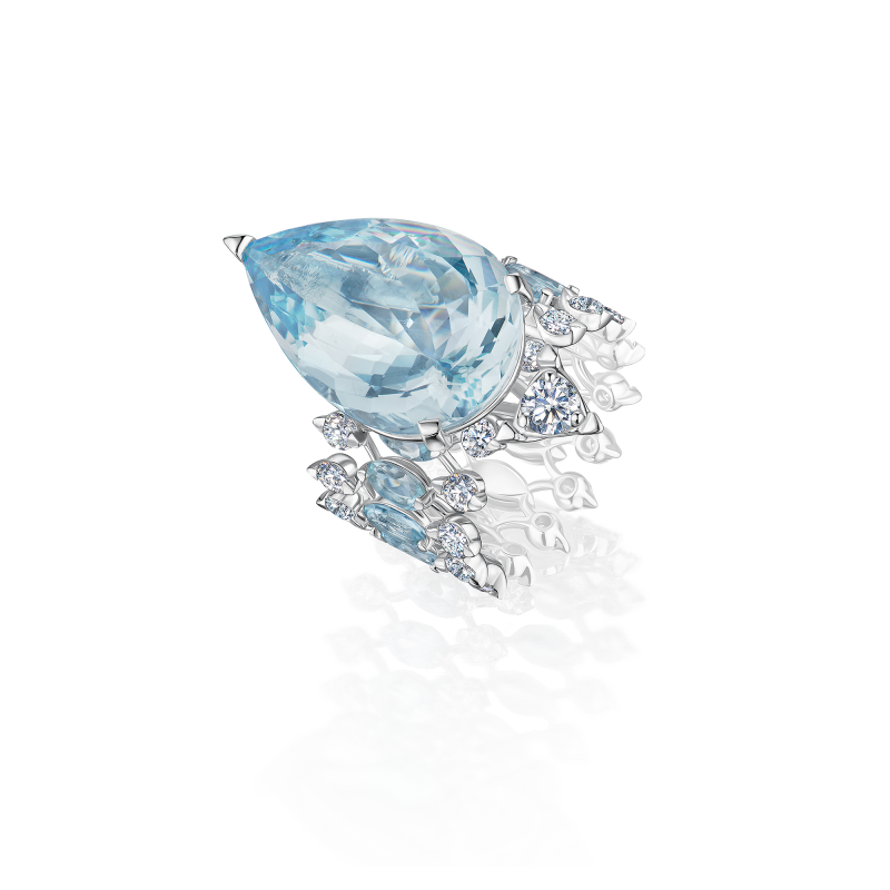 Pear and oval cut aquamarines. Round-cut diamonds.