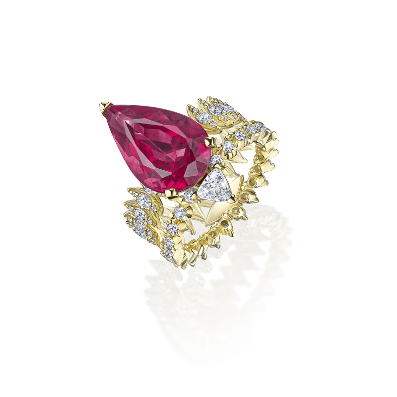 Pear-cut tourmaline. Diamonds of the trillon cut and round cut.