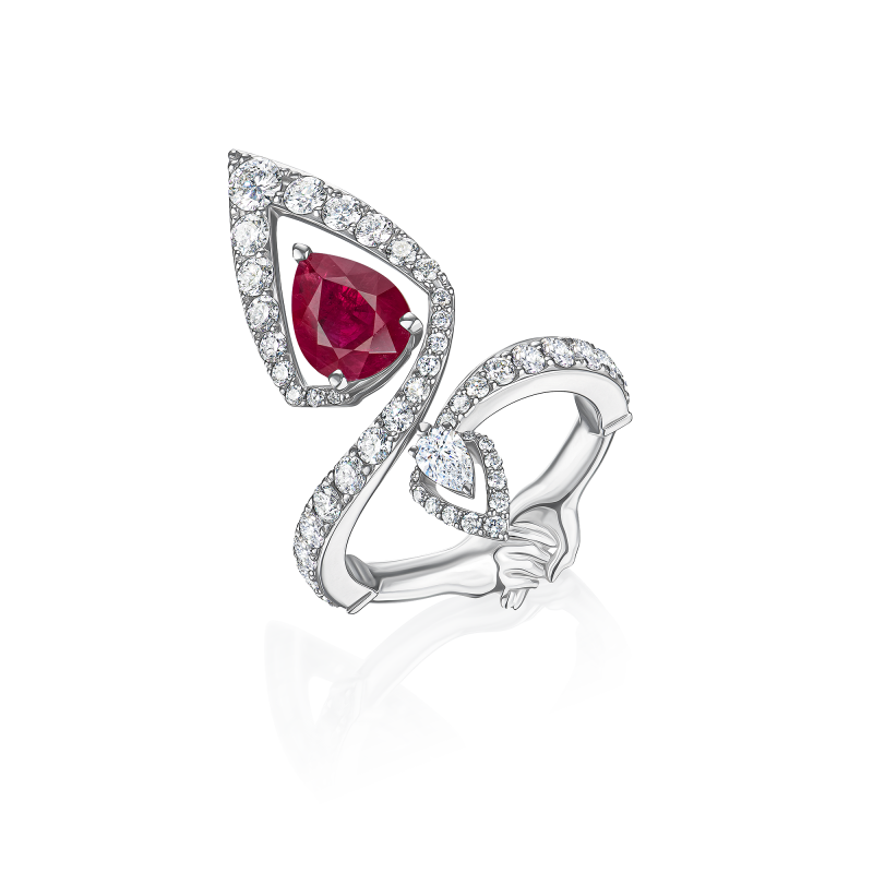 A pear-cut ruby. Pear-cut and round-cut diamonds.