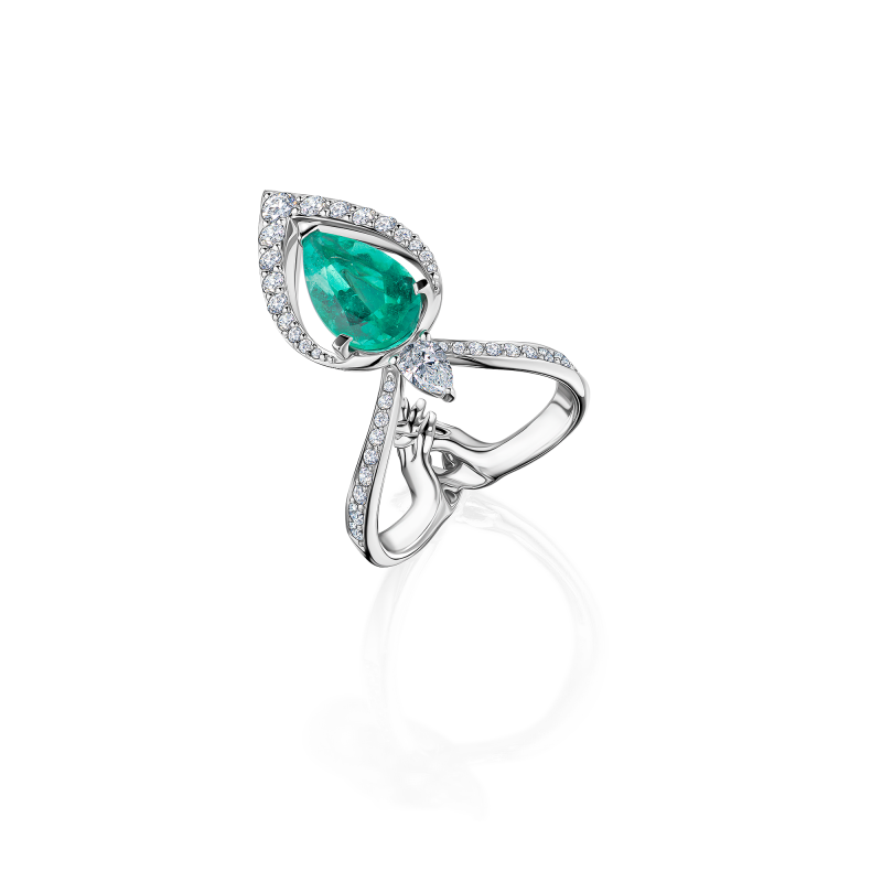 A pear-cut emerald. Pear-cut and round-cut diamonds.