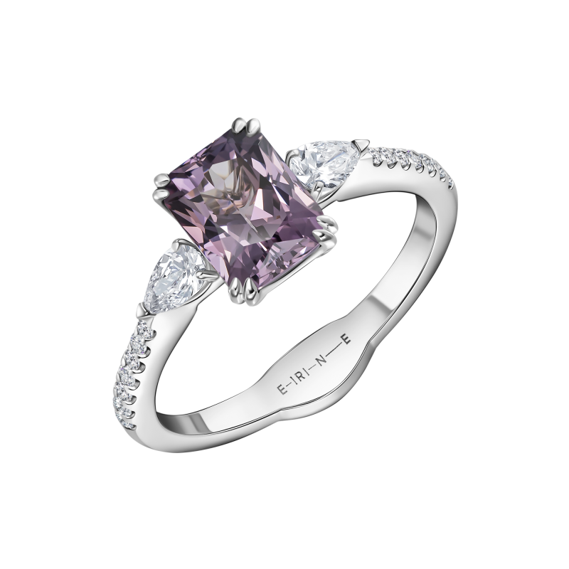 Octagon-cut spinel. Pear-cut and round-cut diamonds.